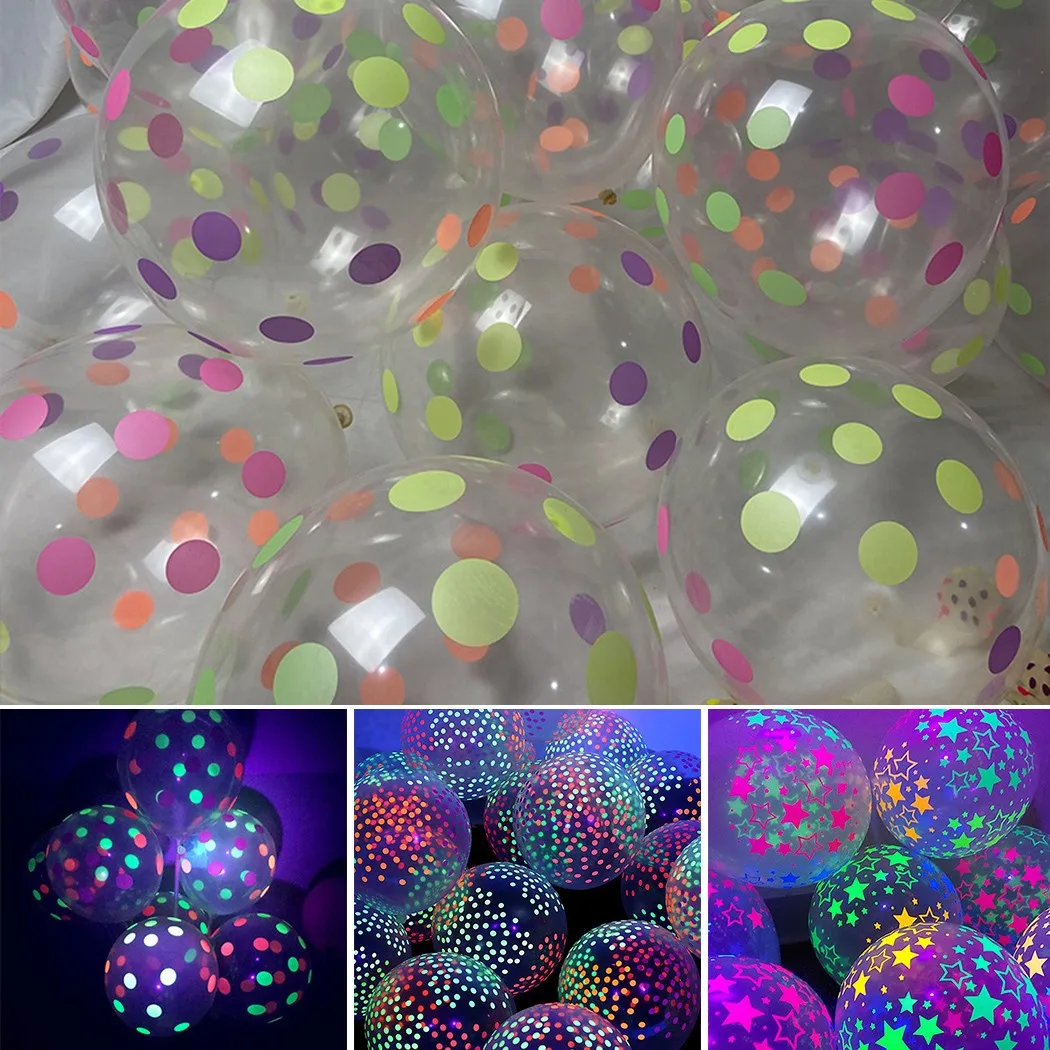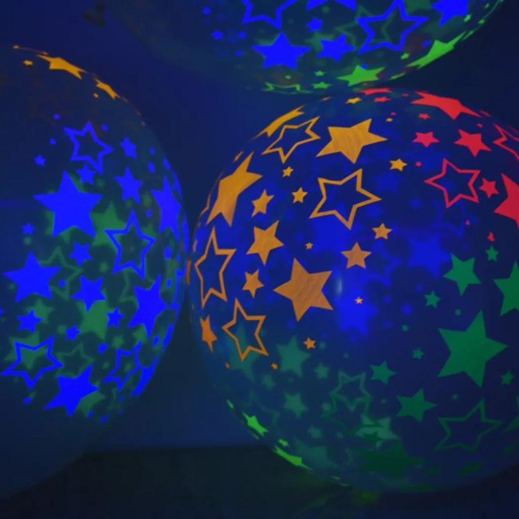 * Прозрачные латексные корпус с яркими разноцветными неоновыми звездами, которые ярко освещают в черном свете, обратите внимание, что эти шары не светится в темноте. Они реагируют только на черный светильник.