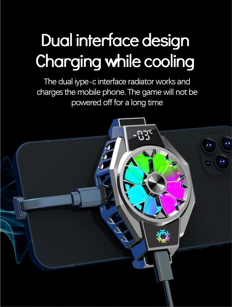 Dual type-C interface, the radiator works and charges the mobile phone. Play and rush the game for a long time without power failure