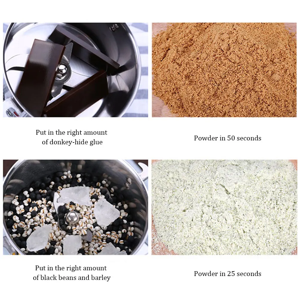 3. Скорость Шлифования быстрая. Время измельчения китайской медицины обычно составляет менее 3 минут, а время дробления-менее 3 секунд. Переключатель времени может установить время шлифования. Шлифовка полностью автоматическая, и использование более удобно.