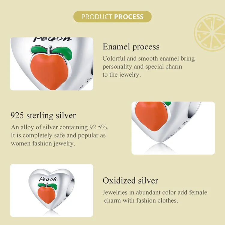 ❤Вдохновение для дизайна❤Используя элемент фруктов, Шарм в форме сердца с летним Персиком, свежий и красивый, используя процесс окисления полировки, чтобы представить зеркальный металлический блеск, выгравированный словом, соответствующим фруктам, полный деталей, простой, но стильный.
