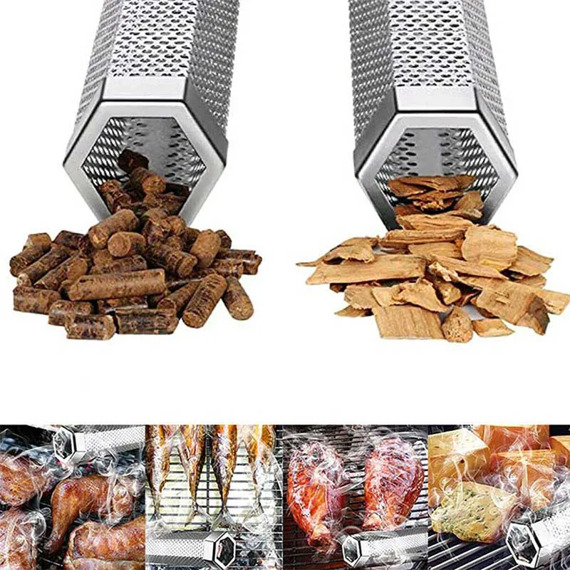 2.ЭтоТрубка для курильщика для барбекюМожно разместить на любом гриле и курильщике, чтобы добавить дымчатый аромат к еде, подходит для горячего и холодного копченого мяса, сыров, орехов и многого другого. Кроме того, можно использовать различные ароматные древесные опилки, такие как вишня, Хикори, легуме, которые можно смешивать, чтобы добавить различные вкусы.