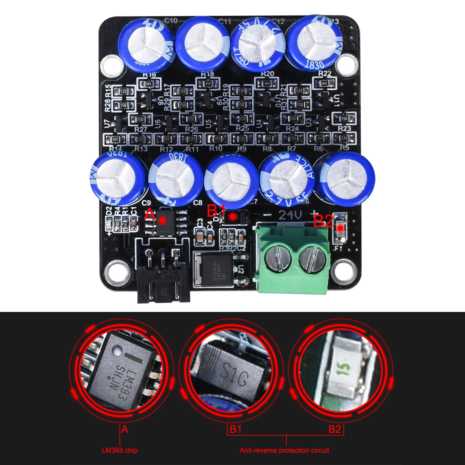 На интерфейсе питания добавляется схема защиты от обратного хода, чтобы предотвратить необратимые повреждения, вызванные обратным источником питания, что значительно защищает печатную плату.