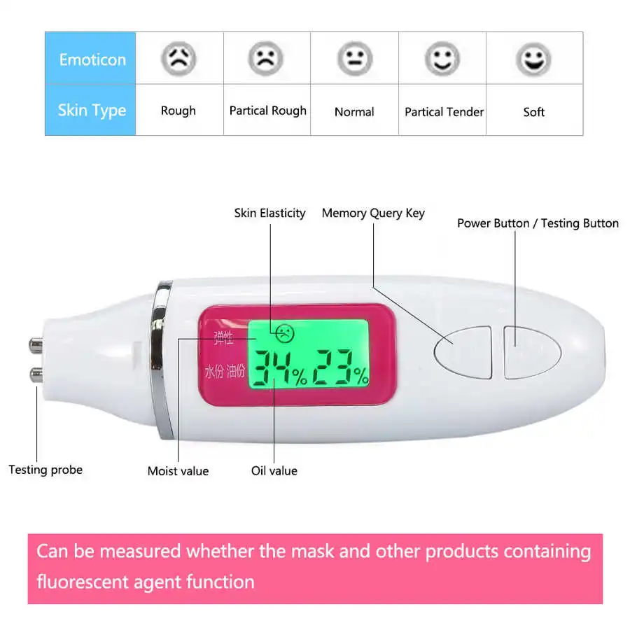2. Может использоваться для проверки влажности кожи, масла кожи и типа кожи, а также может использоваться для обнаружения флуоресцентного излучения.