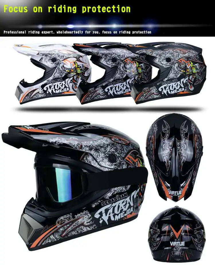 Посылка включает в себя: 1 шлем для мотокросса + 3 бесплатных подарка:(1 пара очков (цвет случайный цвет) + 1 пара перчаток + 1 маска),