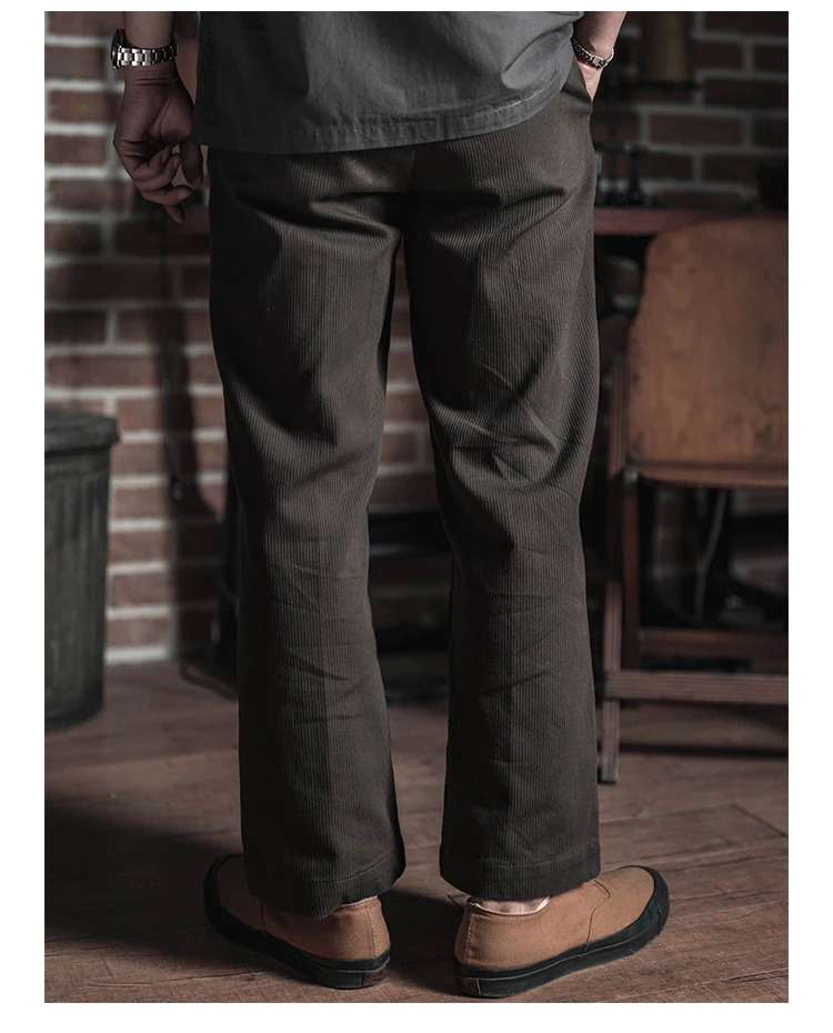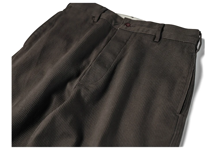 Эти брюки не изготовлены из вельвета, а изготовлены из окрашенной на заказ ткани с кордовым покрытием, с классической высокой талией и более широкими ножками, придающими ощущение ретро.
