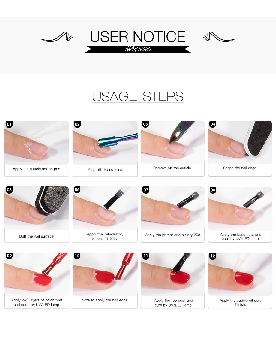 -6. Remove the tacky residue on nails with the cleanser. Then, apply nourish cuticle oil to rehydrate moisture into the cuticle and the skin surrounding the nail.
