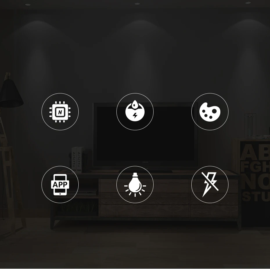 Различные функцииНаслаждайтесь умной и удобной жизньюЧип высокой яркостиЭнергосберегающийВысокая цветопередачаУправление через приложениеВысокая светопроницаемостьБез стробоскопа