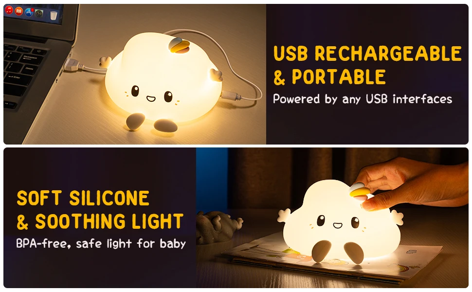 * Управление нажатием и яркие цвета: Кнопка питания находится внизу. После включения вы можете нажать на облако, чтобы перейти от белого к более яркому белому (50% и 100%), а затем изменить цвет. Наш Ночной светильник оснащен управлением краном, который может быть легко управляется детьми в ночное время. Этот продукт построен с удобством и простотой в использовании.