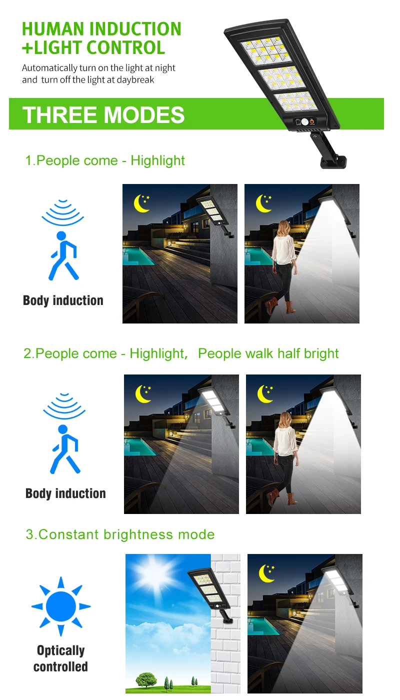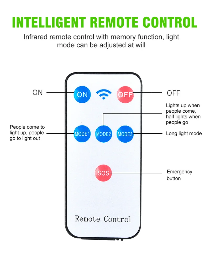 -Автоматическое включение: датчик движения PIR может сканировать источник тепла, который непрерывно перемещается в пределах диапазона обнаружения. Когда кто-то появится в области, светильник автоматически включится.