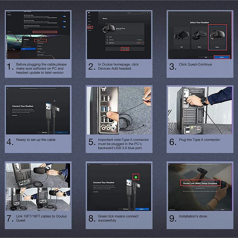 3) Кабель связи для Oculus Quest: для Oculus Link подключает гарнитуру для Oculus Quest/для Quest 2 к игровому ПК, поэтому вы можете играть в различные приложения и игры Oculus Rift, И в то же время зарядите гарнитуру Oculus Quest/for Quest 2.