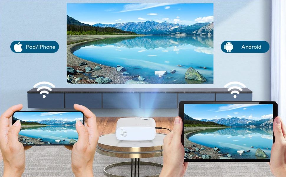 Этот wifi проектор позволяет Зеркалировать экран с вашего телефона/планшета/окна через wifi. Вам не нужен дополнительный адаптер HDMI или WiFi. Проецируйте свой маленький экран на больший экран без проводов!