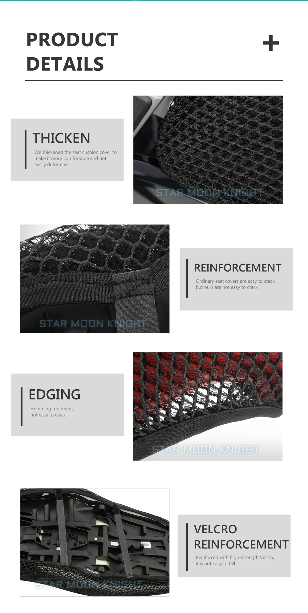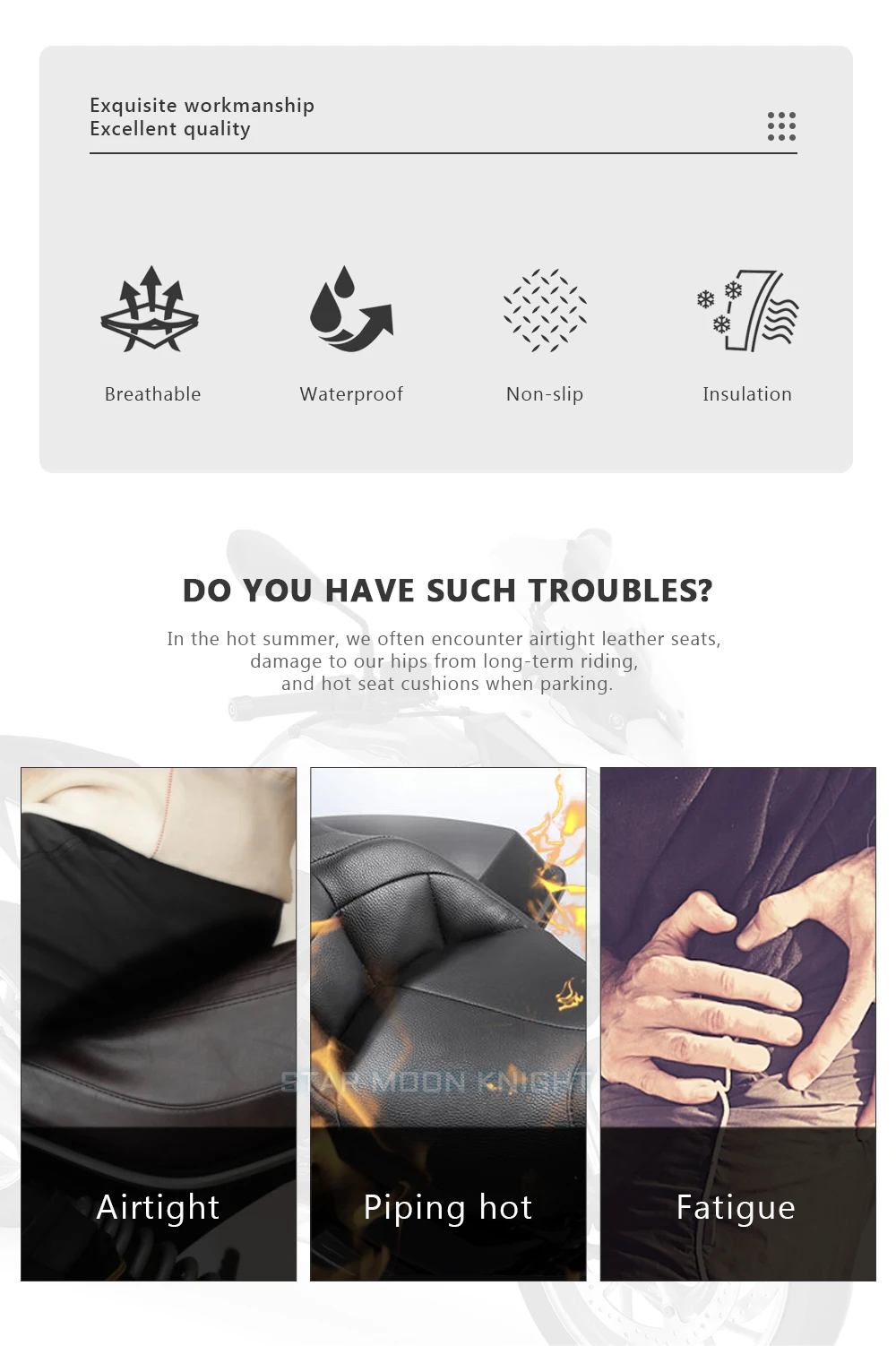 Permanent air circulation and cooling while driving Keeps the buttocks dry even in the rain Does not heat up even in strong sunlight