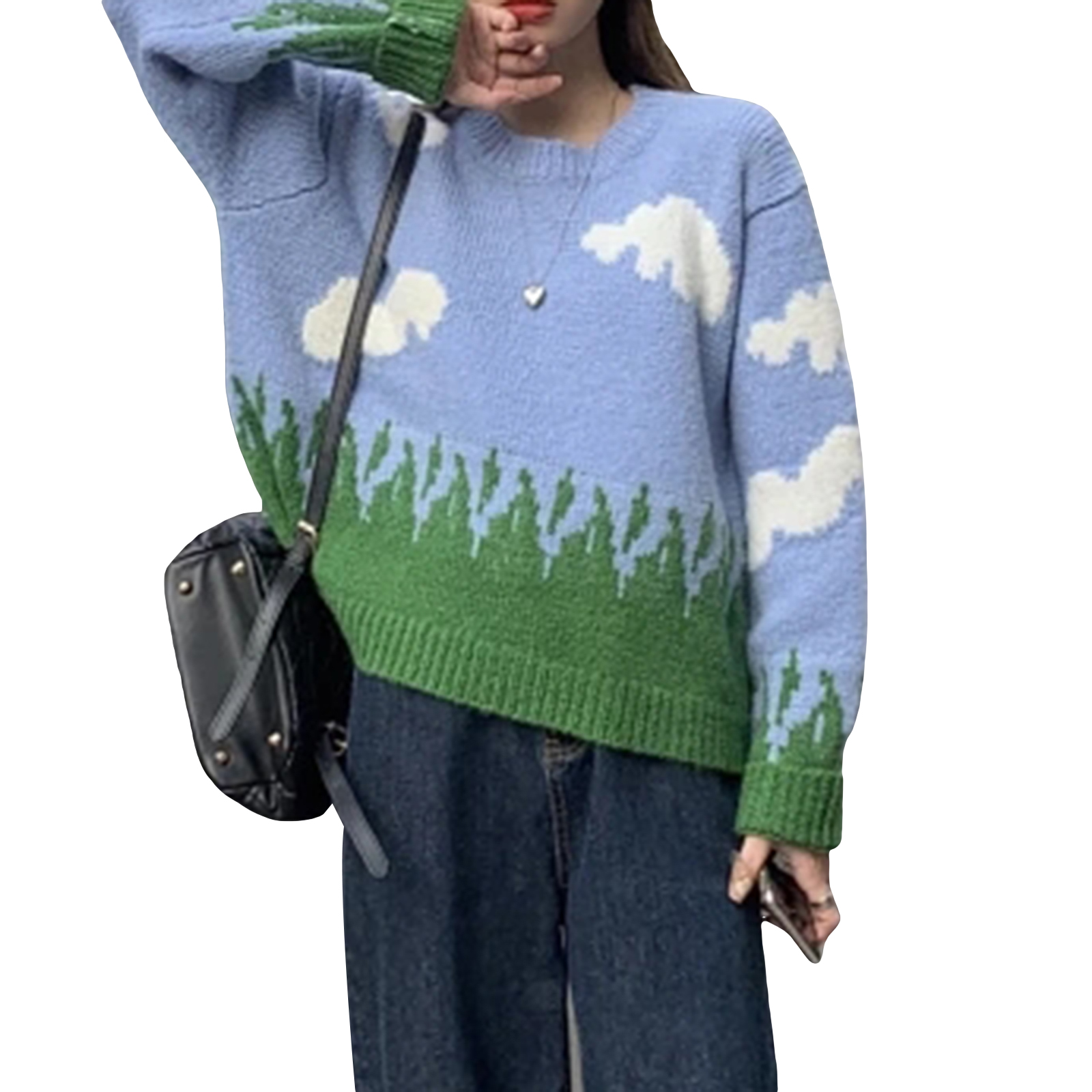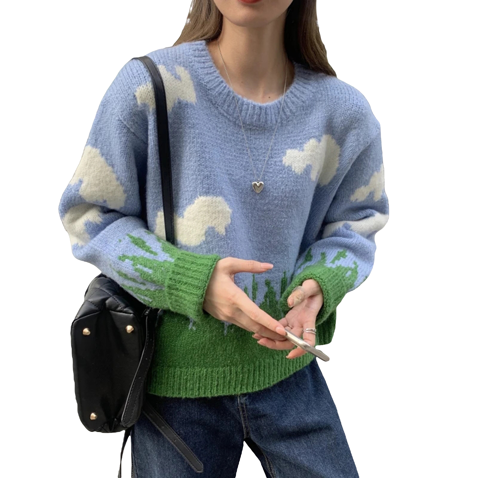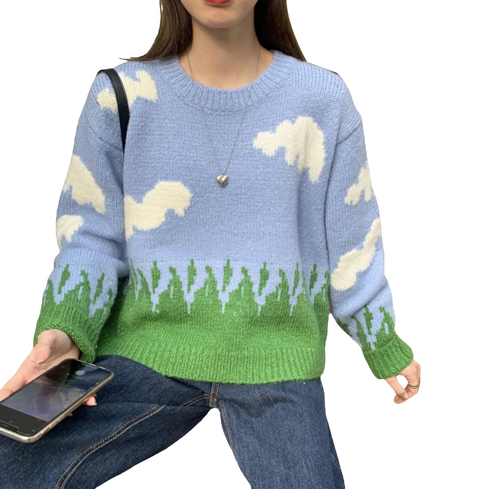 Женские свободные свитера с круглым вырезом, Повседневные вязаные пуловеры с длинным рукавом и принтом облачной травы