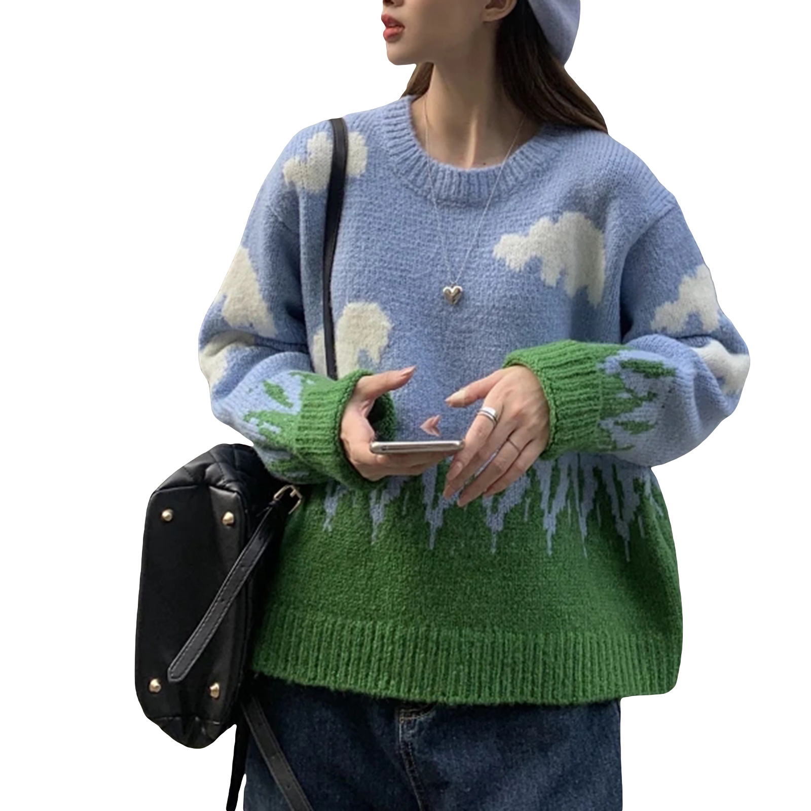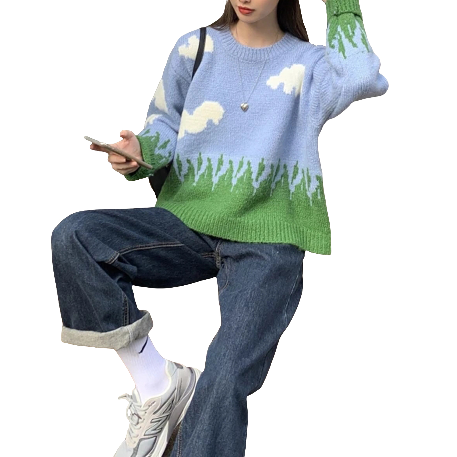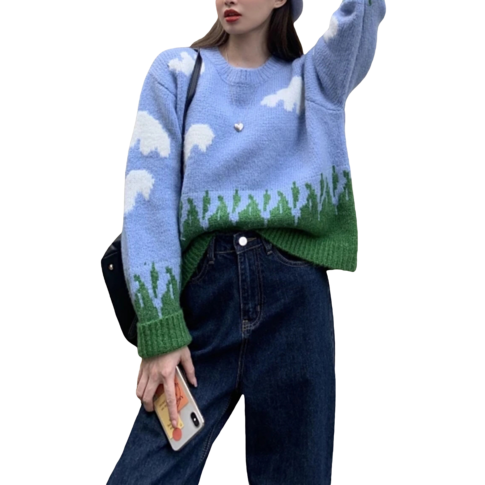 Женские свободные свитера с круглым вырезом, Повседневные вязаные пуловеры с длинным рукавом и принтом облачной травы