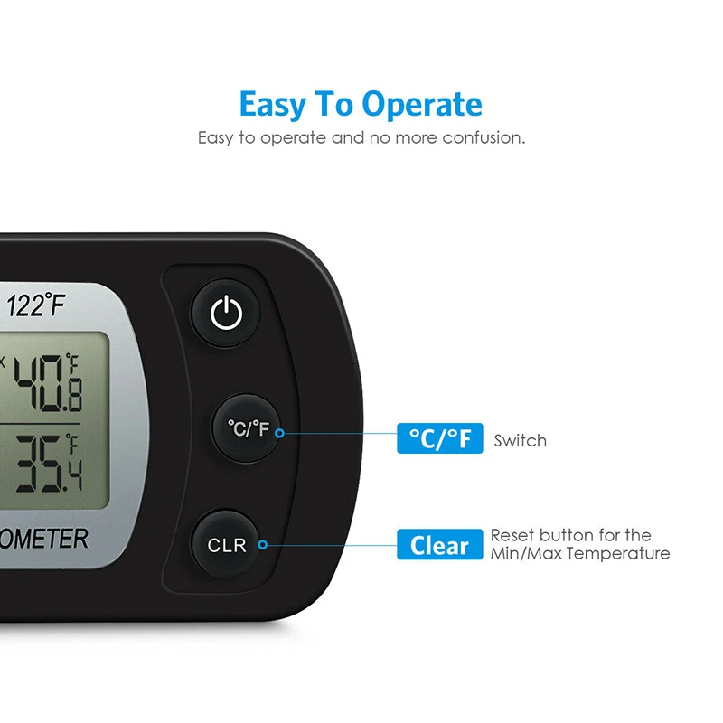 Простая и интеллектуальная работа: есть только 3 кнопки простого электронного термометра. Просто нажмите кнопку включения или выключения, чтобы включить/выключить термометр. Нажмите кнопку °C/ °F, чтобы выбрать по Цельсию или по Фаренгейту. После перезагрузки термометра Максимальная/минимальная температура будет сброшена.