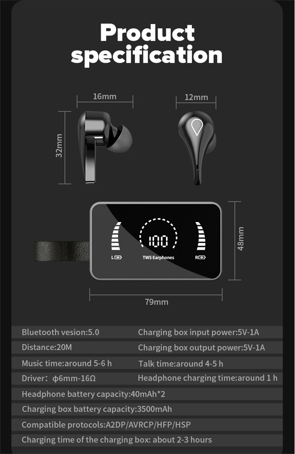 TWS беспроводные Bluetooth наушники HD светодиодный дисплей зеркальный экран наушники с 3500 мАч зарядная коробка 9D HIFI стерео наушники