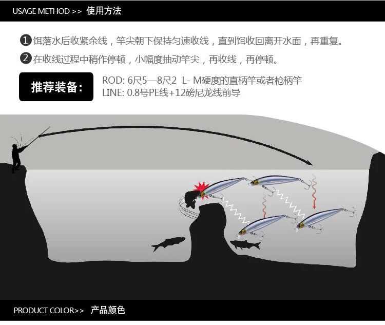 Линия занята с равномерной скоростью, и приманка делает стабильную осанку плавания с высокочастотным переворачиванием в воде. Слегка нарисуйте кончик удочки, и приманка может бегать влево и вправо под водой, что может эффективно побудить большую рыбу атаковать.