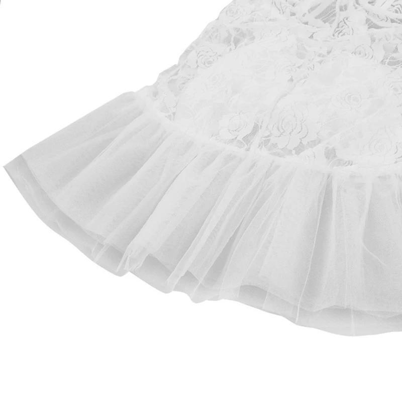 Регулируемые бретельки-спагетти перекрещиваются сзади. Большой прошитый бант сзади. Кружевной лиф с цветочным рисунком и сетчатым подолом.