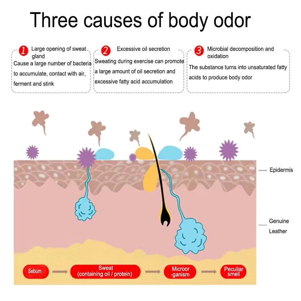 Three causes of body odor1. Large opening of sweat glandCause a large number of bacteria to accumulate,contact with air,ferment and stink.2.Excessive oil secretionSweating during exercise can promote a large amount of oil secretion and excessivefatty acid accumulation.3.Microbial decomposition and oxidationThe substance turns into unsaturated fatty acids to produce body odor.