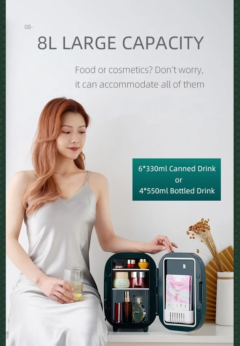 Его внутренняя емкость специально увеличена до 8 л, что позволяет ей легко вместить даже 6 банок 330 мл колы. Будьте уверены, что он достаточно вместителен, чтобы хранить все ваши средства по уходу за кожей.