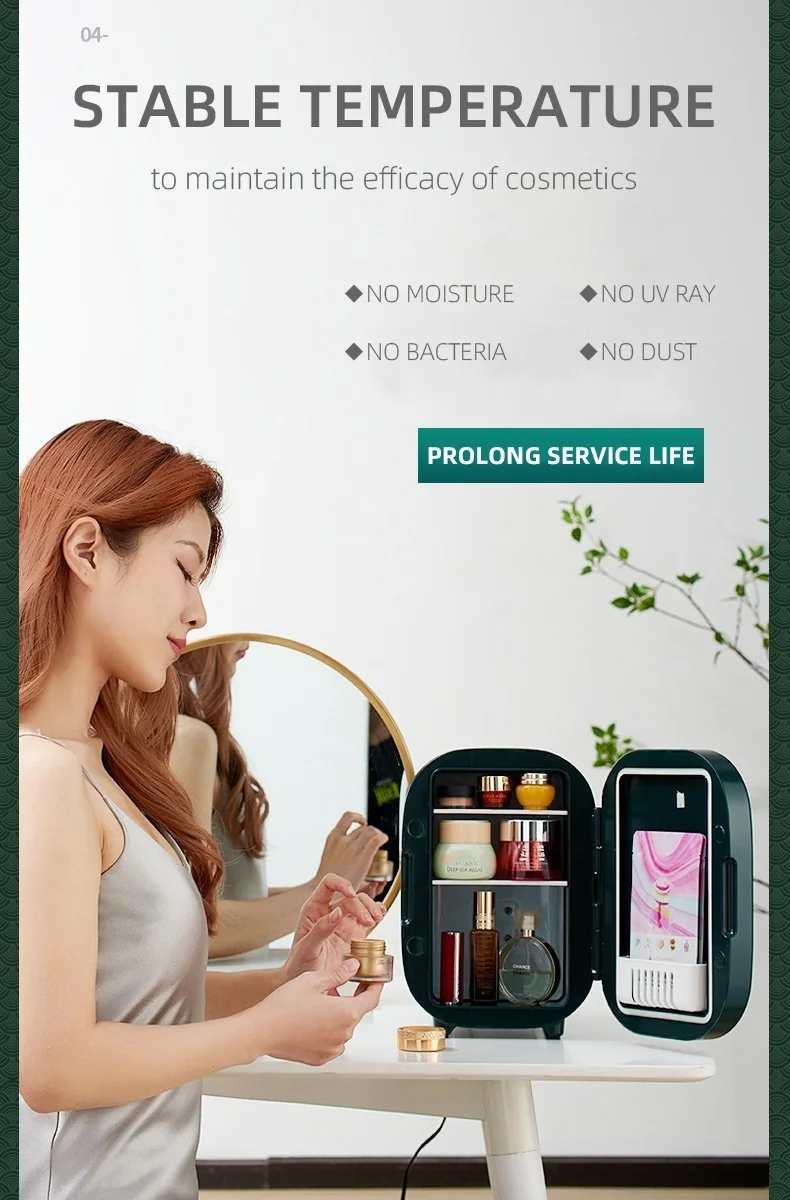 Принимает новейшую полупроводниковую холодильную систему, обеспечивая 360 ° круглую, свежую и сухую среду для косметики, эффективно сохраняя их эффективность и избегая их плавления.