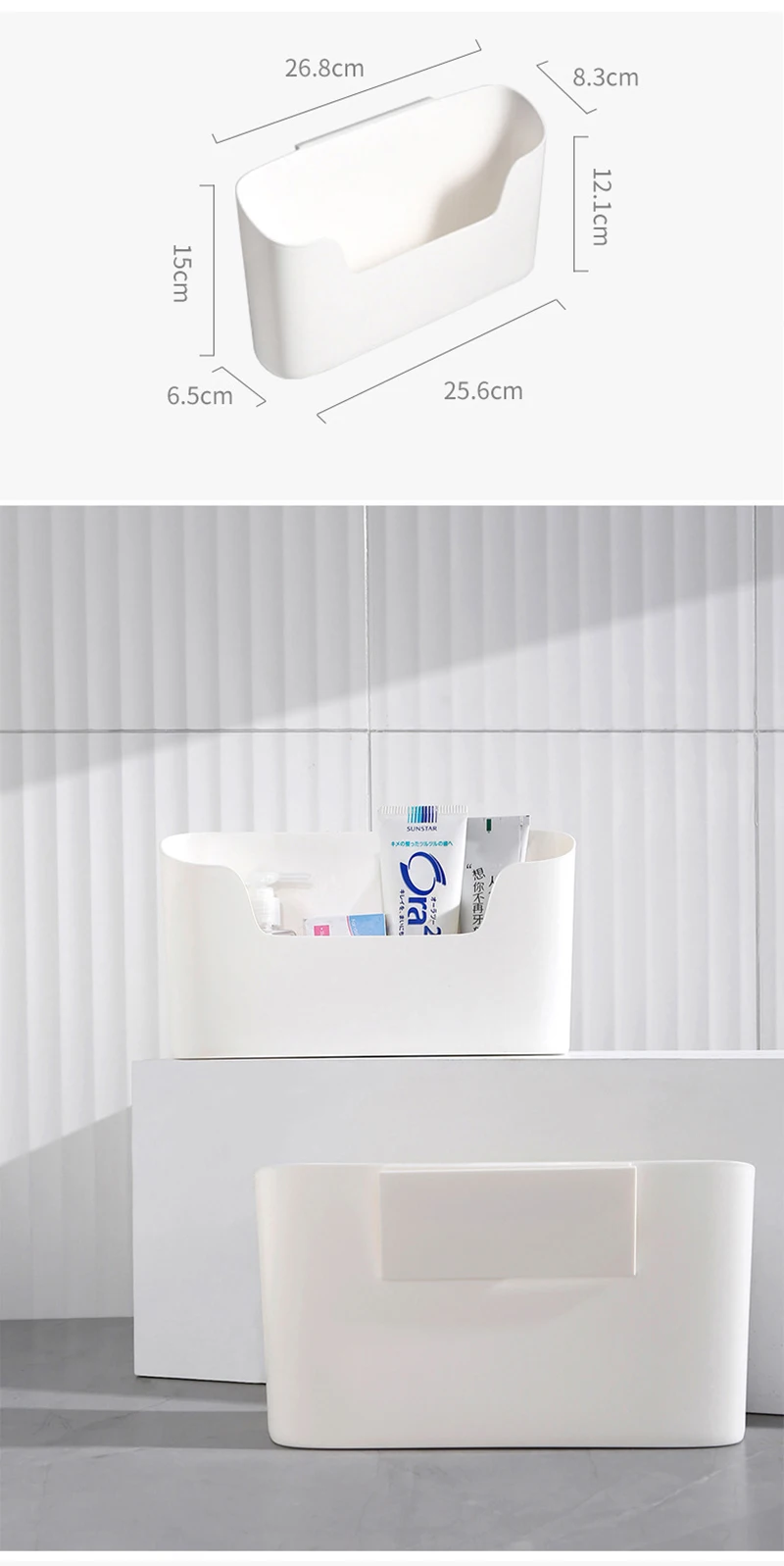 Характеристики:-самоклеющаяся установка, не штамповка-подходит для косметики для ванной комнаты, приправ бутылок и банок в кухонных шкафах, офисных журналах и канцелярских принадлежностей, холодильных боковых стеллажей и т. д. Спецификация: Название изделия: настенная коробка для хранения Материал: пластик Размер: 26,8*8,3*15 см цвет: белый В комплект входит: 1 коробка для хранения