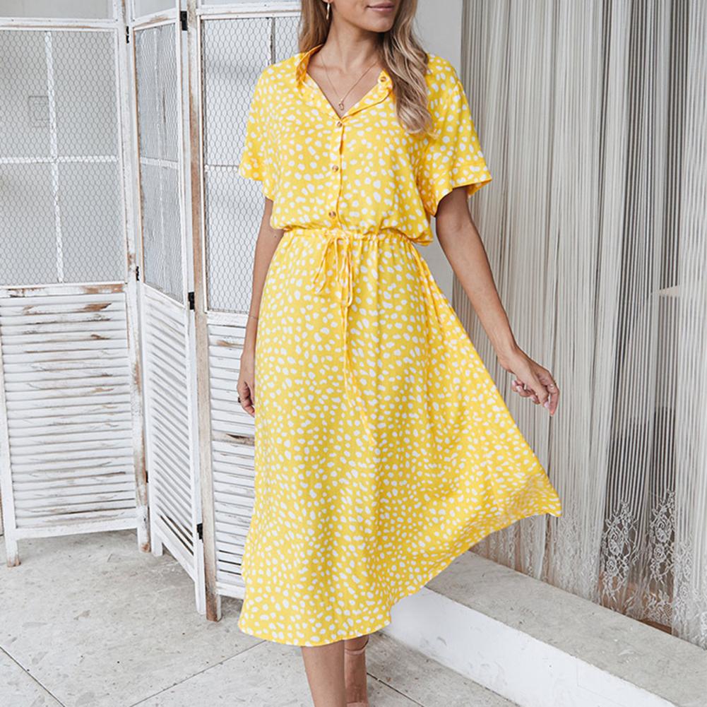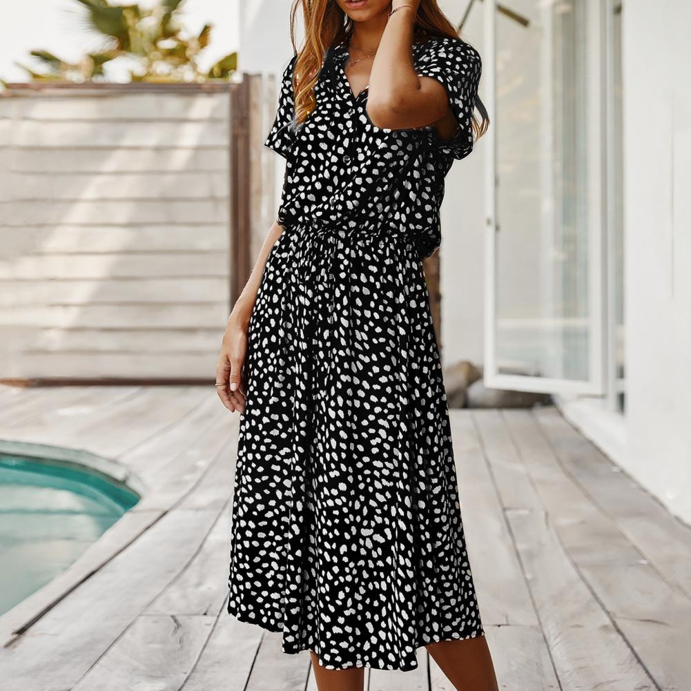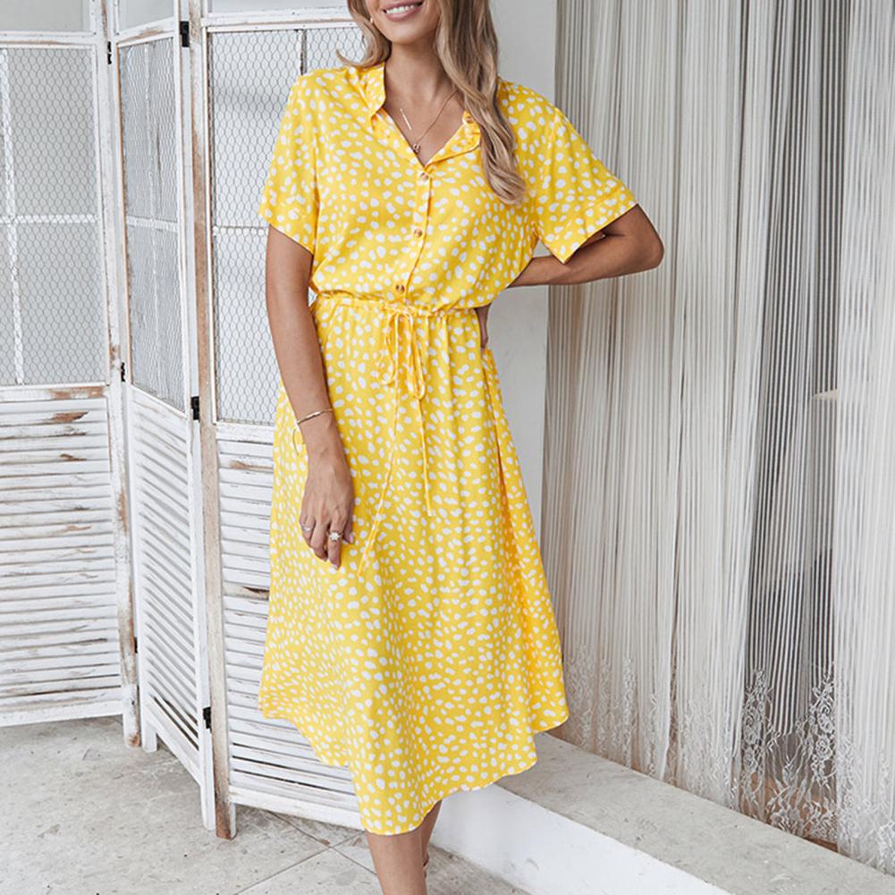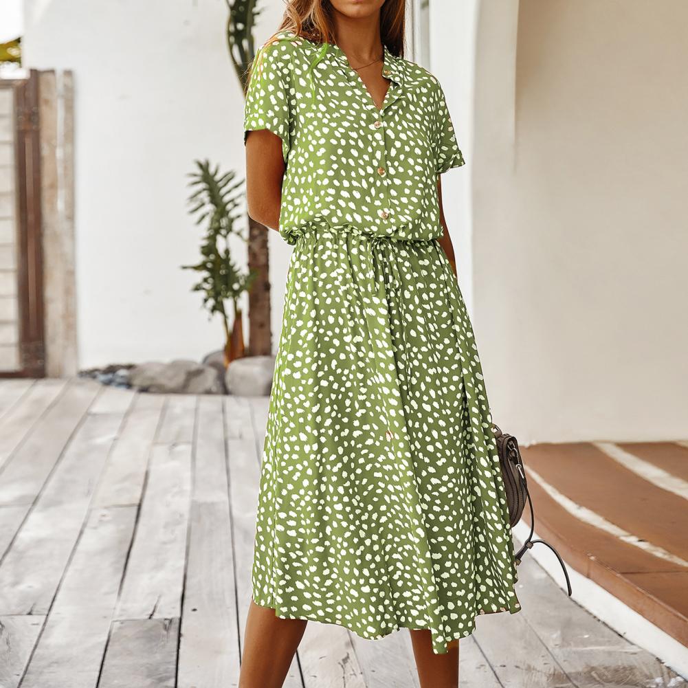 Платье-рубашка Boho с принтом в горошек, свободное женское платье с коротким рукавом на шнуровке и пуговицами для свиданий