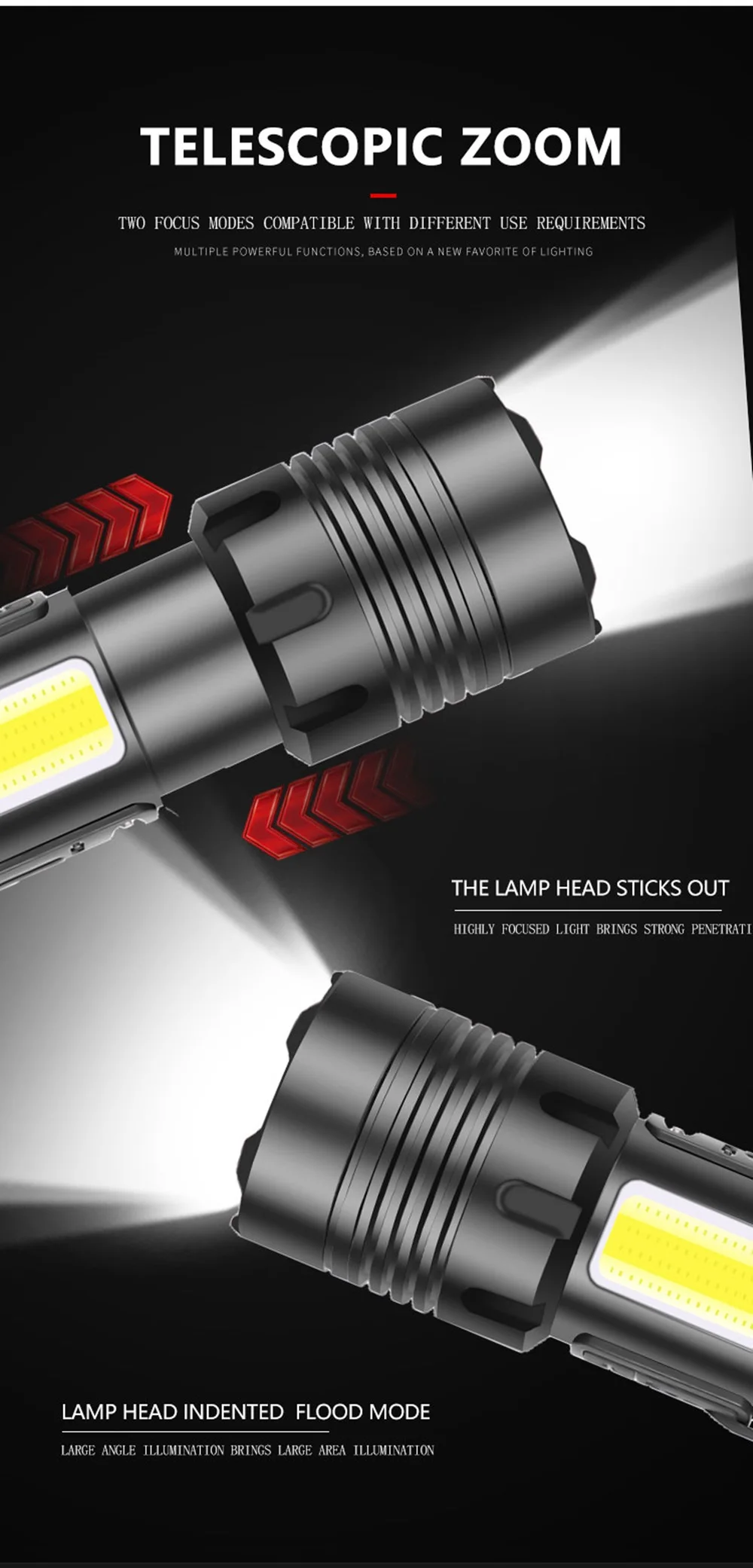 4. P70 3 режима: сильный светильник-слабый светильник-стробоскоп-двойной щелчок для открытия COB-Длительное нажатие для выключения
