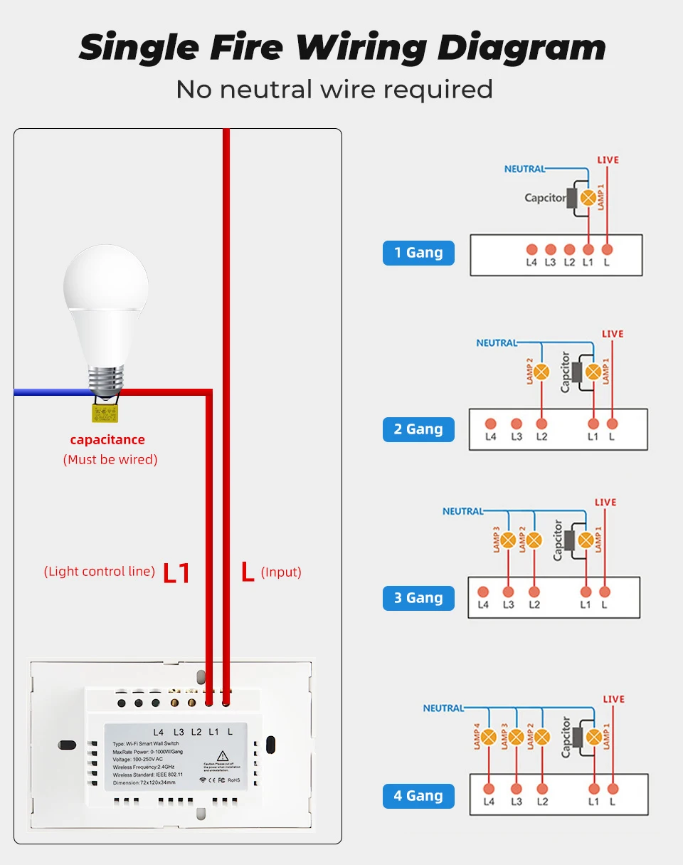 Нет необходимости в нейтральной линии: Простая установка, подходит для большего количества семей. Но вам нужно установить конденсатор на лампу L1