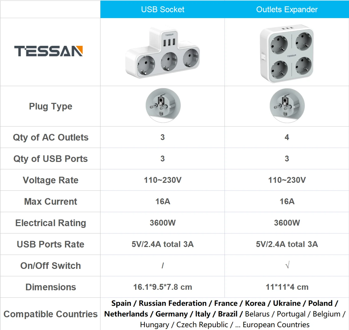 4-полосная штепсельная вилка с 3 портами (стандарт:В TESSAN Мощность лента подходит для подключения к стандартному Пособия по немецкому языку (4,8 мм) с заземлением розетки, просто подключите его к любому Deutsch резьбой раструбного соединения для вы получаете удлинитель для 4-полосная и 3-сторонний выход розетки. Usb-розетки. Эта лента питания USB может удовлетворить ваши потребности в зарядке в одном месте.