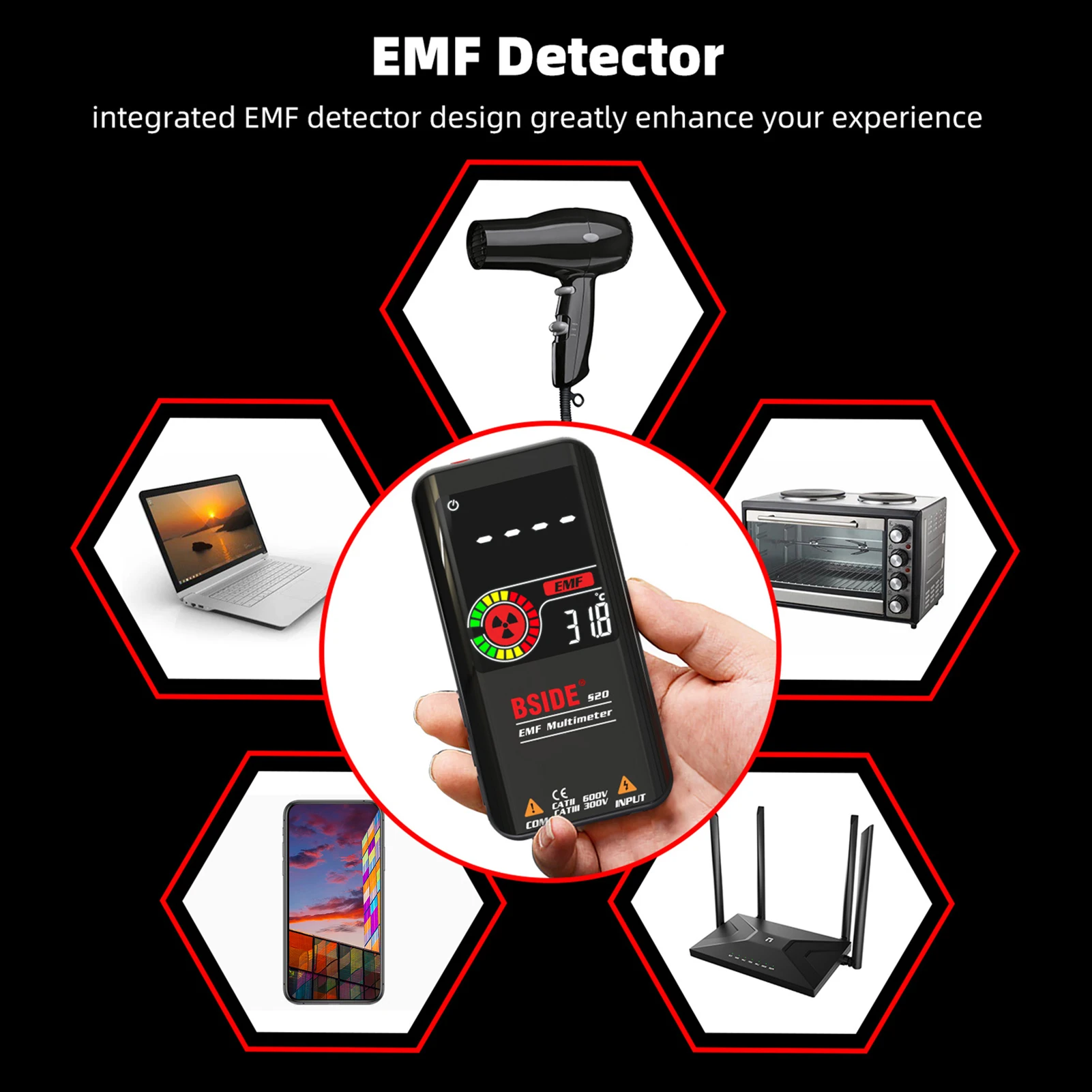 Домашнее Обнаружение электромагнитного излучения: верхняя Индукционная зона для идентификации высокочастотного электромагнитного излучения, излучаемого микроволновой духовкой, электрическим вентилятором или кондиционером. И имеет значок и 3-цветный аналоговый барграф отображается, как только электромагнитное излучение распознается, звуковой сигнал одновременно.