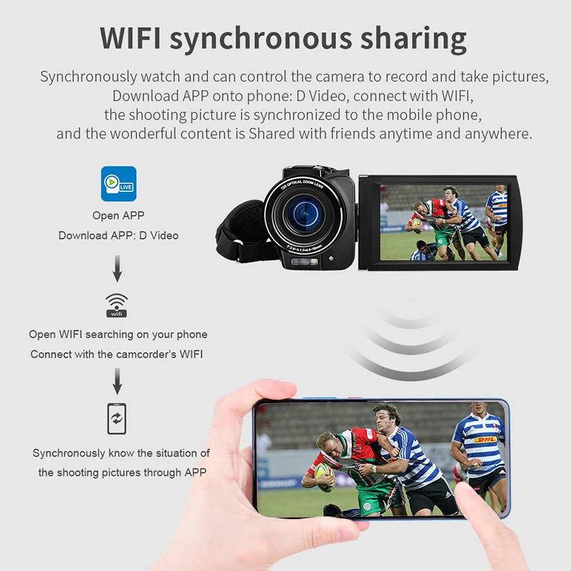 Смарт-Wi-Fi Функция: вы можете подключить камеру через Wi-Fi с помощью вашего смартфона удаленно, для просмотра камеры в прямом эфире экран и используйте свой телефон, чтобы записывать или съемки. (допустимый диапазон: 9,8 футов). Вы можете мгновенно поделиться видео со своим другом. Вы можете скачать приложение «D Video» непосредственно с помощью сканирования qr-кода в руководстве пользователя или поиска в APP Store.