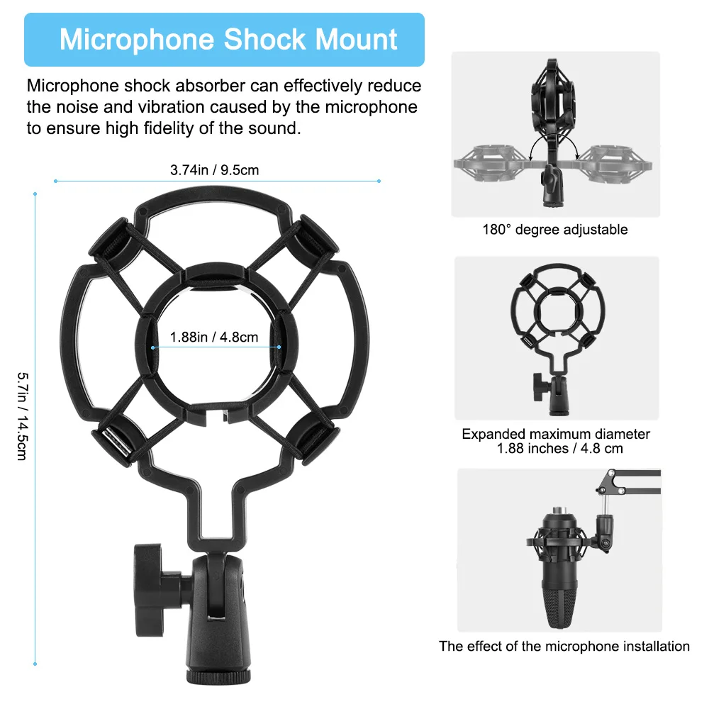 Амортизатор для микрофона может эффективно уменьшить шум и вибрацию, вызванные микрофоном, чтобы обеспечить высокую точность звука. (Обратите внимание, что ударное крепление не подходит для Blue Yeti)