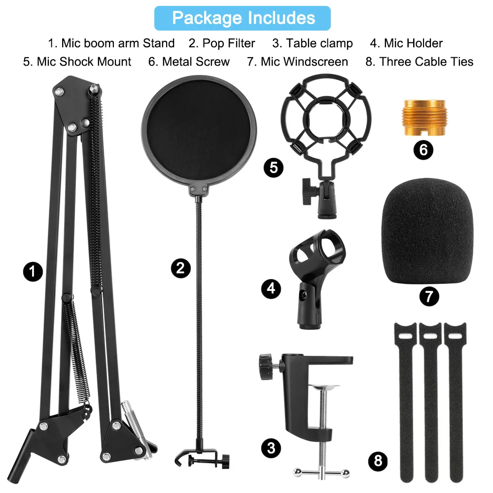 1. Сверхмощная подставка для микрофона (длина: 35 см/13,77 дюйма) 2. Четыре кабельные стяжки 3. Зажим для стола (подходит для столов толщиной до 2 "/ 5 см) 4. Металлический винтовой адаптер (3/8" до 5/8 ") 5. Двухслойный поп-фильтр для микрофона