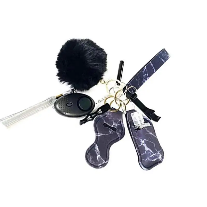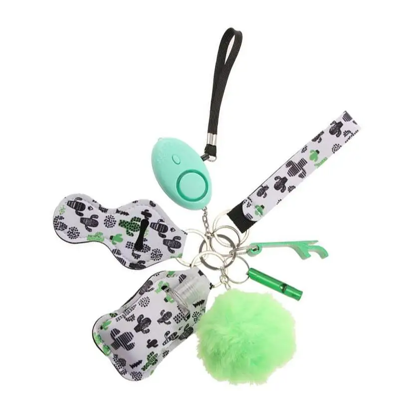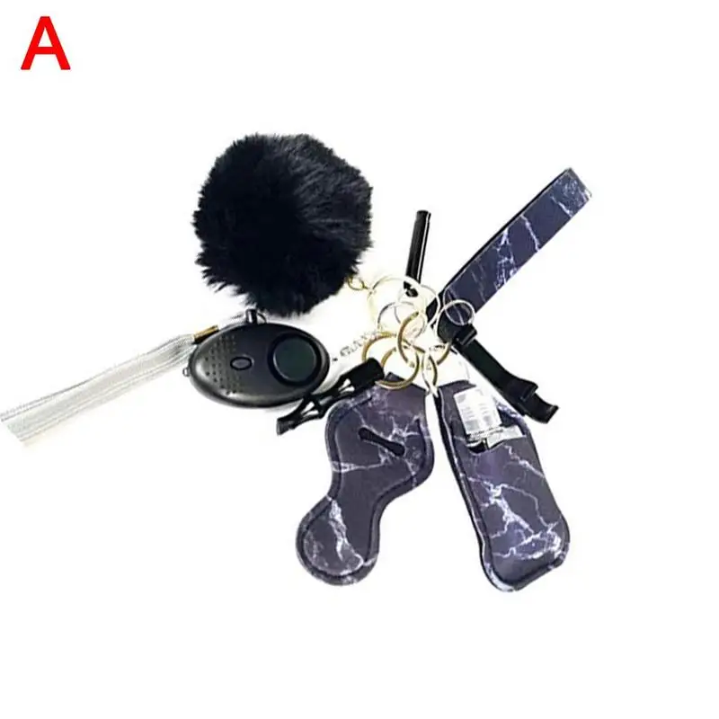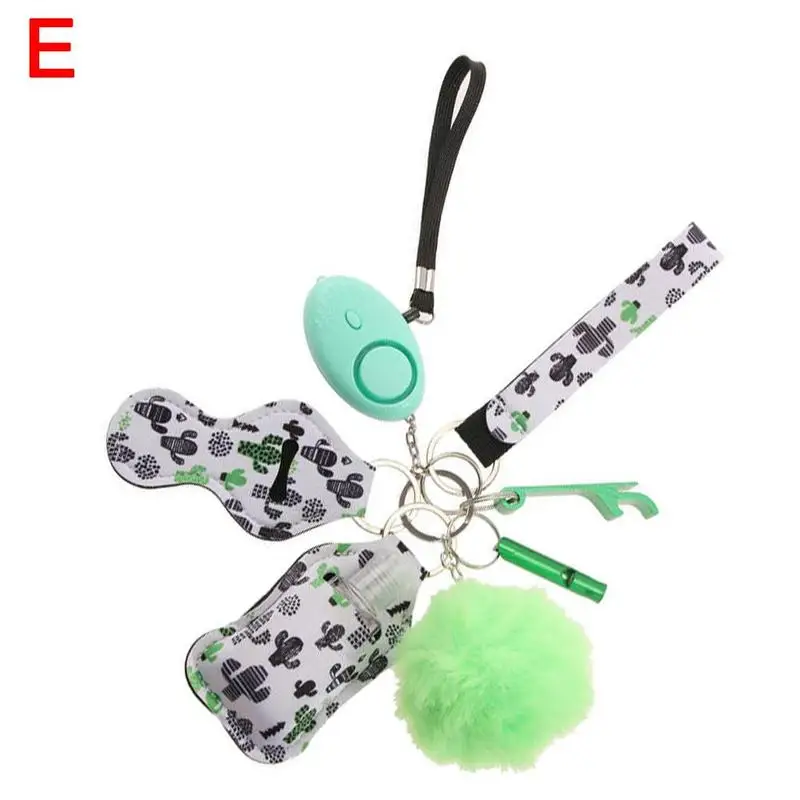 Уникальный Набор Ключей Безопасности из 9 элементов включает ремешок на запястье, будильник 130 децибел с фонариком, открывалка для бутылок, ручной держатель для чистки пустых бутылок 30 мл, держатель для помады, выключатель окна, помпон и свисток.