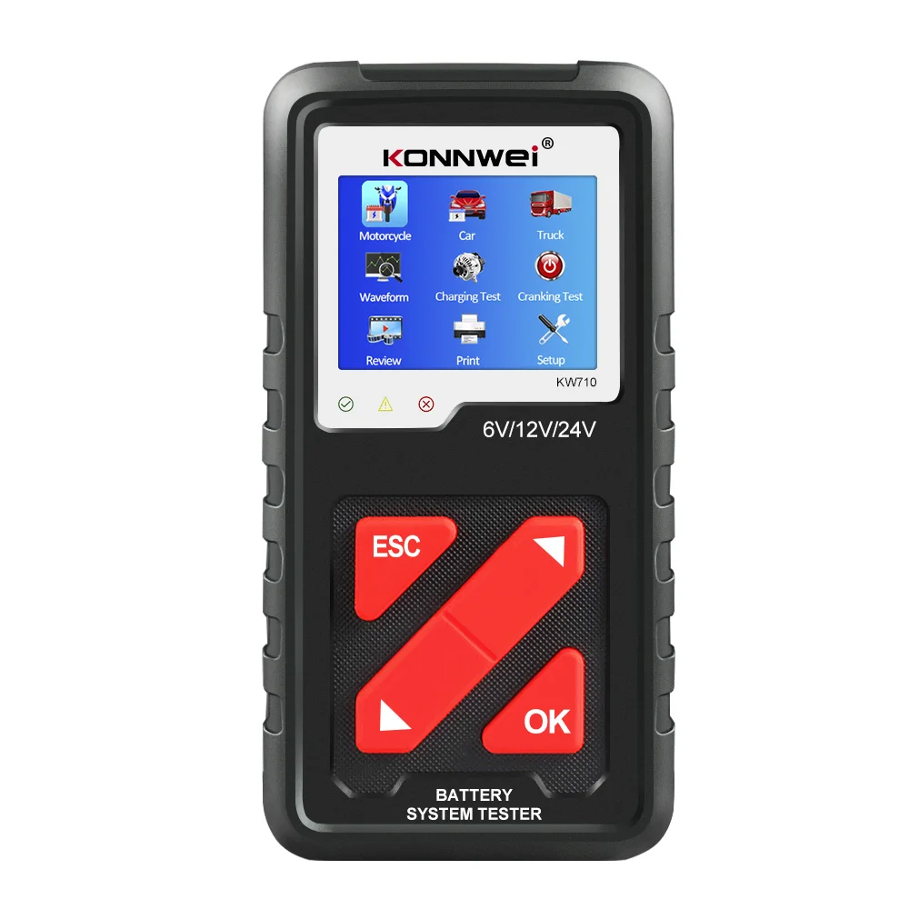 KONNWEI KW710 батарея тестер новый аккумулятор системы батареи аналитический инструмент для автомобилей, грузовиков и мотоциклов с функцией тестирования от 6 в, 12 В до 24 В различных батарей, он может быстро и точно узнать состояние вашего аккумулятора, включая состояние зарядки, процент жизни, внутреннее сопротивление и так далее. Кроме того, это также может помочь вам проверить состояние двигателя транспортного средства, неисправность зарядки аккумулятора и т. д. KONNWEI KW710-это профессиональный автомобильный диагностический инструмент для всех видов проблем, связанных с батареей, он обеспечивает профессиональный мониторинг напряжения батареи и функцию загрузки для глубокого анализа. С 3,2 дюймов цветной экран и уникальный дизайн, наиболее распространенных типов аккумуляторов, включая обычный свинцово-аккумуляторная батарея AGM, аккумуляторная батарея AGM спираль, гель лак для ногтей, EFB и т. д., KW710-это идеальный и надежный инструмент для системы аккумуляторов для всех D-I-Yers и профессионалов.