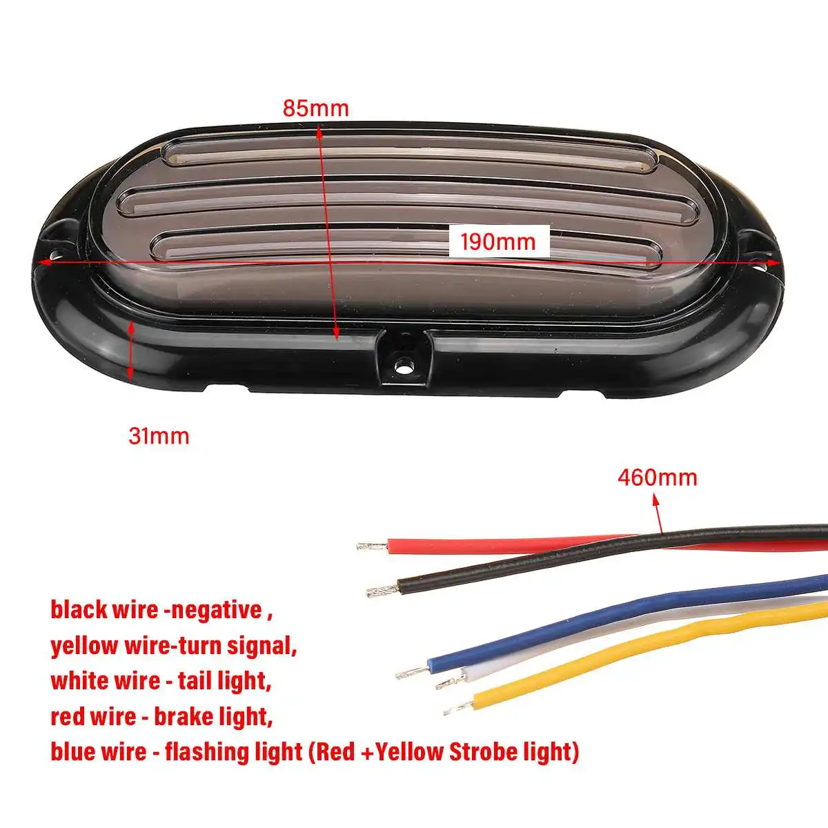 Color function: Driving light red low light + brake light red high light + flowing yellow turn signal light + red and yellow strobe light or White and yellow strobe light.