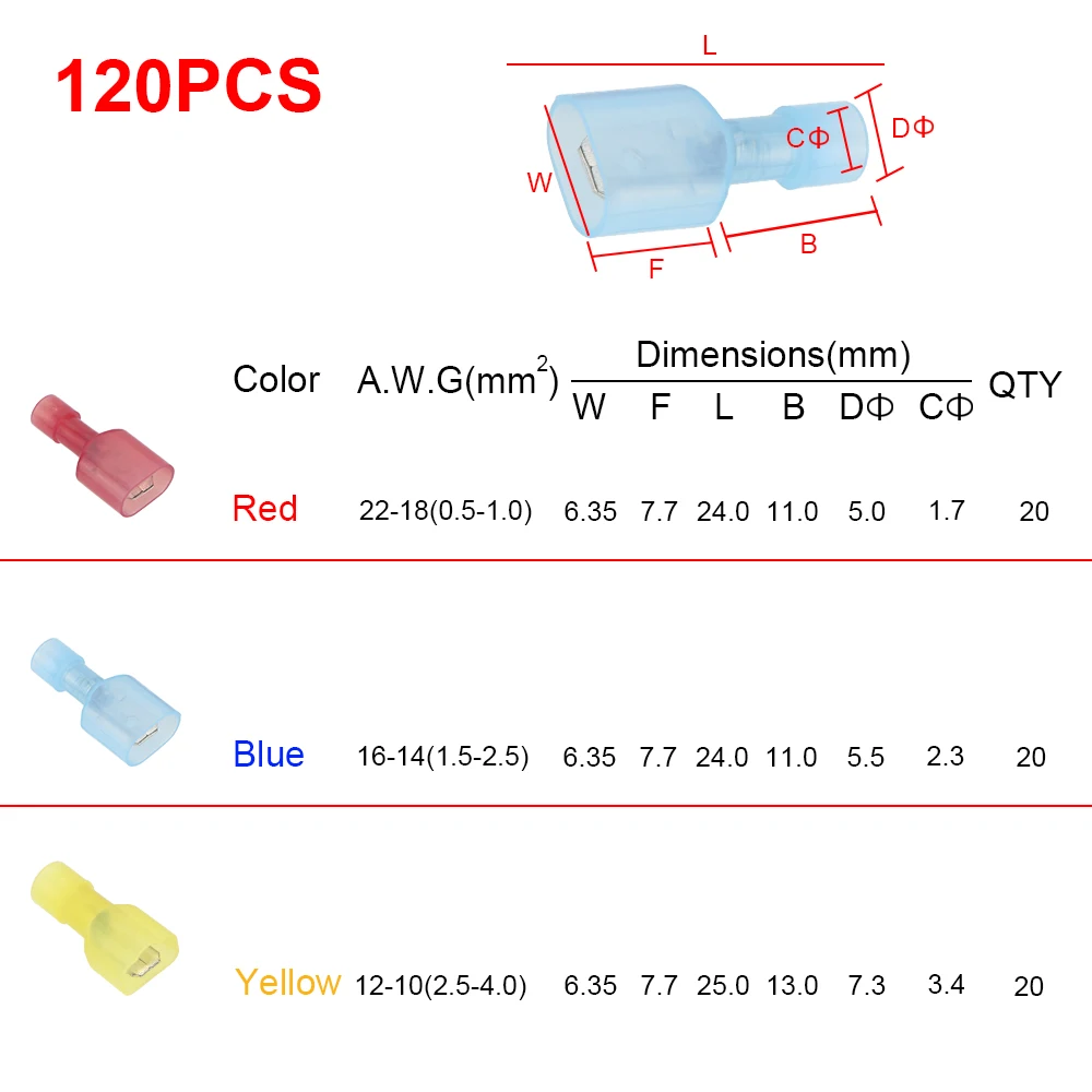 Подходит для провода: 22-18AWG (красные разъемы), 18-14AWG (синие разъемы), 12-10AWG (желтые коннекторы)