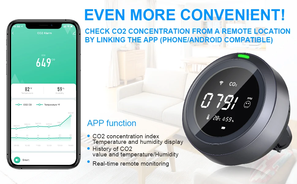 2 года облачного хранения и 24 часа отслеживания данных! Когда вы просыпаетесь по утрам и хотите проверить качество воздуха в ночное время в вашей спальне/детской комнате, вы можете отслеживать данные истории, нажав на температуру/влажность в приложении. Этот тестер CO2 контролирует качество воздуха в реальном времени для вашей семьи в ночное время!