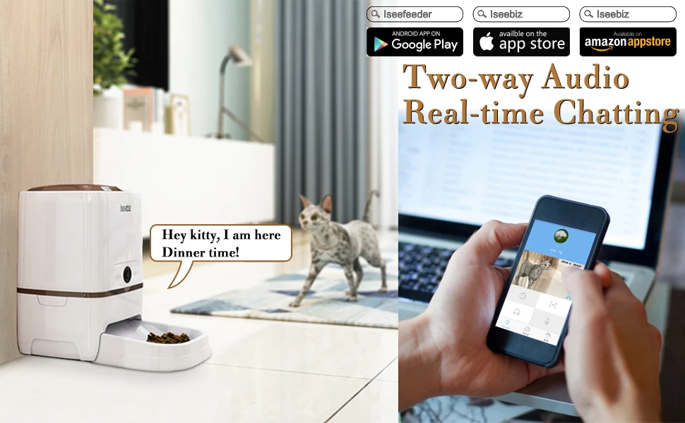 Совместимость с Alexa вы просто следуйте инструкции по эксплуатации для подключения Iseebiz Smart Feeder к домашней сети Wi-Fi 2,4 ГГц (не поддерживает 5 ГГц).