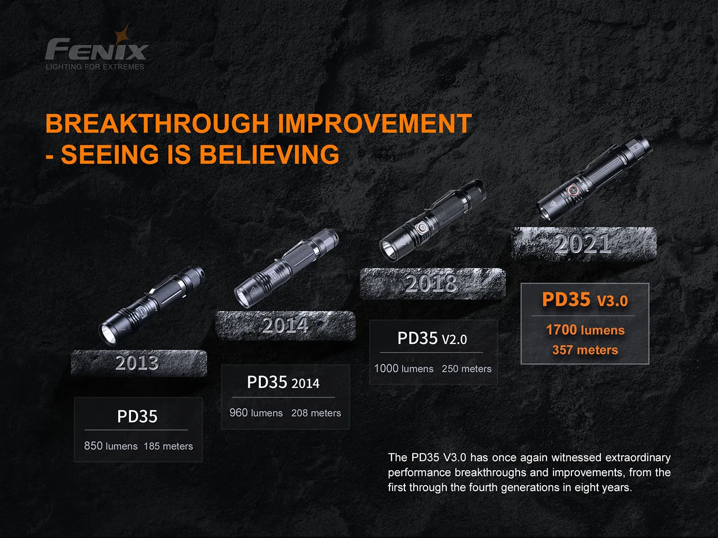 Улучшенный фонарик PD35 V3.0 предназначен для обогащения фонарей серии PD35. Этот светильник обеспечивает максимум 1700 люменов на расстоянии 357 метров. Этот Fenix PD35 V3.0 компактный, но прочный и имеет пять уровней выхода плюс мгновенный стробоскоп. Конструкция двойного переключателя, тактический задний переключатель и металлический боковой переключатель, который также имеет встроенный индикатор уровня заряда батареи, обеспечивают быструю и удобную в использовании работу. Идеально питается от одной перезаряжаемой литий-ионной батареи 18650, она также совместима с двумя холодостойкими батареями CR123A. Все эти основные моменты делают Fenix PD35 V3.0 очень подходящим для военного использования, полицейской деятельности, прогулок на открытом воздухе, аварийного освещения, использования фонарика EDC и многого другого.