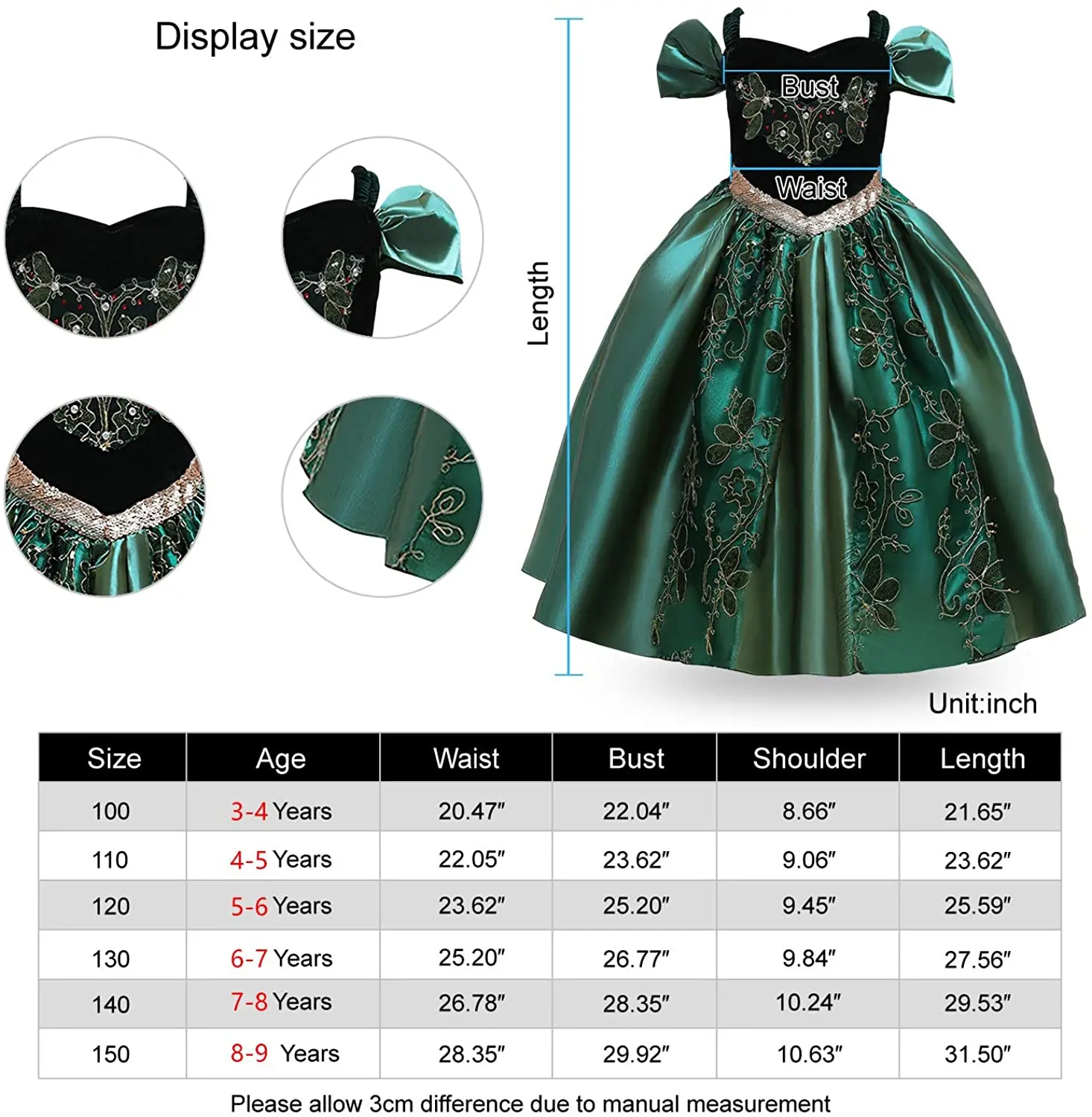 (От 8 до 9 лет) 150 см Грудь: 29,92 "/76 см + Талия: 28,35"/72 см + Длина: 31,50 "/80 см