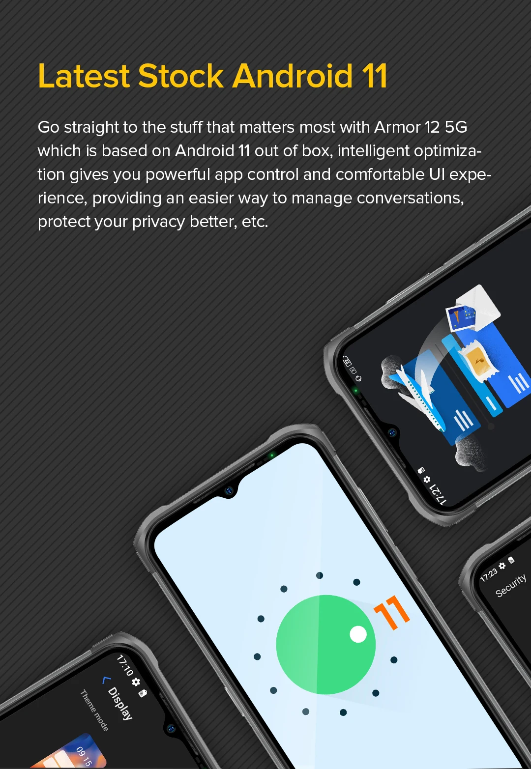 Перейдите прямо к тому, что больше всего имеет значение с Armor 12 5G, который основан на Android 11 из коробки, интеллектуальная оптимизация дает вам мощное управление приложением и комфортный пользовательский интерфейс, обеспечивает более простой способ управления беседами, лучше защищает вашу частную жизнь и т. Д.