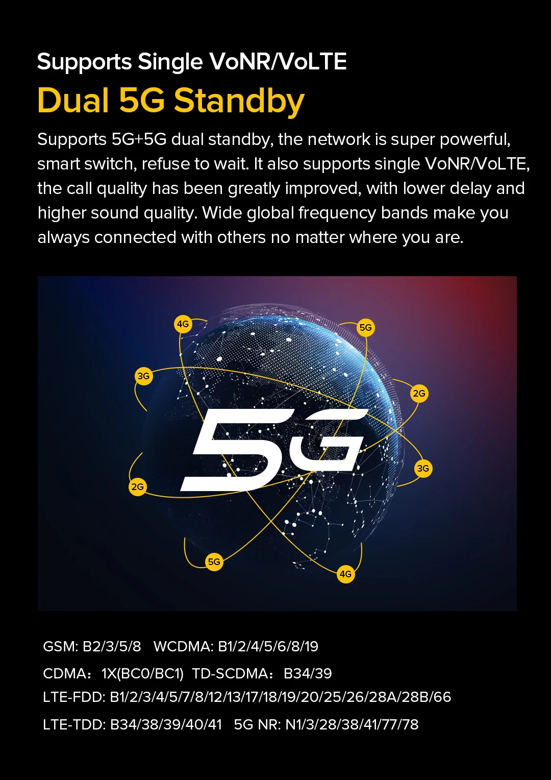 Поддерживает 5G + 5G двойной режим ожидания, сеть супер мощная, интеллектуальное переключение между sim-картами в любое время, откажитесь ждать. Он также поддерживает один VoNR/VoLTE, качество вызова было значительно Улучшено, с более низкой задержкой и более высоким качеством звука. Широкий диапазон частот позволяет вам всегда подключаться к другим, независимо от того, где вы находитесь.