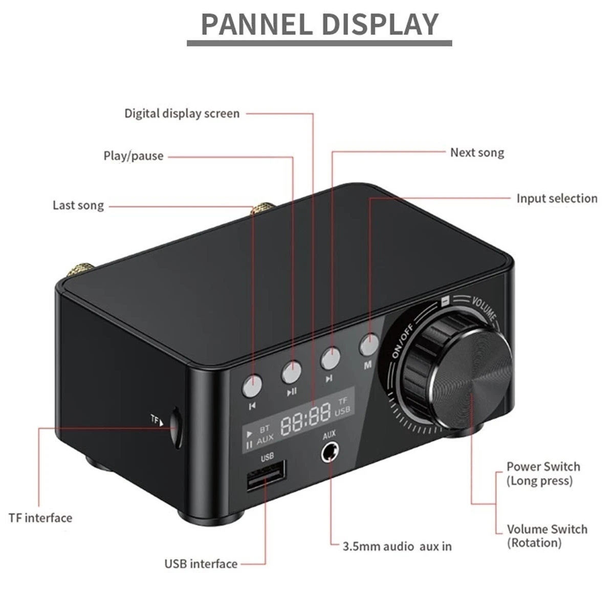 Чистый и четкий звук Hi-Fi, отсутствие слышимого шума, наш инженер потратил много времени и усилий на оптимизацию цепи, чтобы гарантировать отсутствие шума даже на максимальной выходной мощности (100 Вт (50 Вт * 2) Максимальная выходная мощность, подходит для большинства домашних динамиков.)