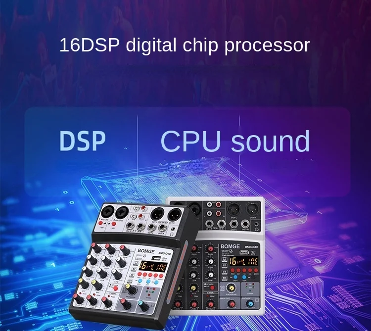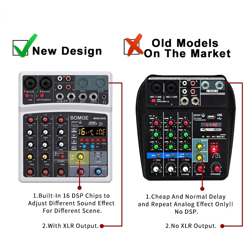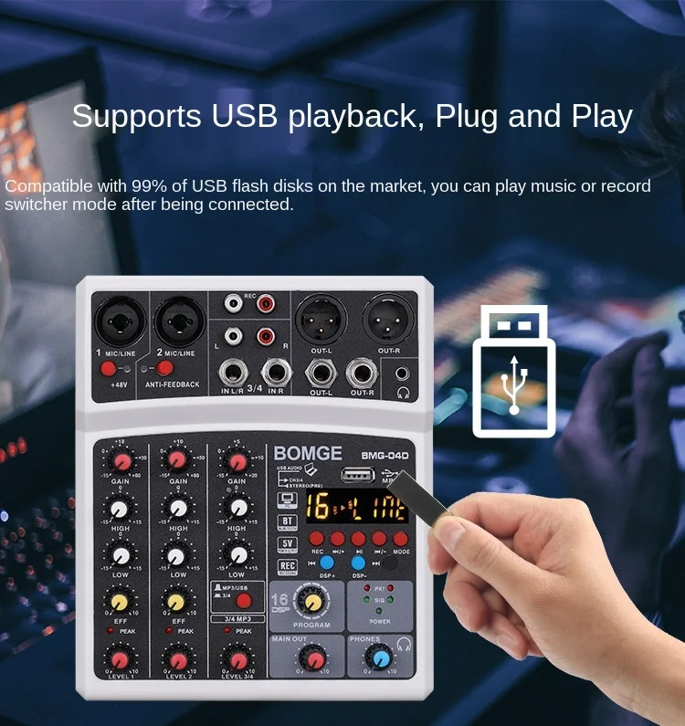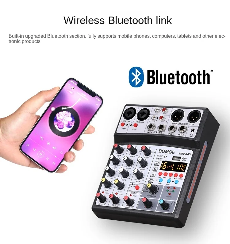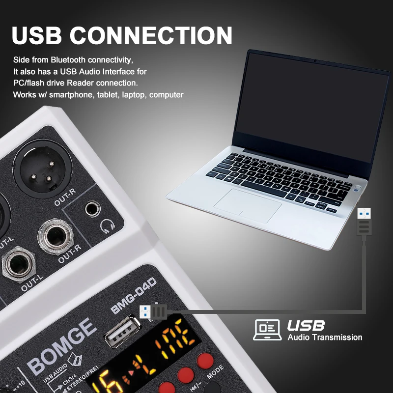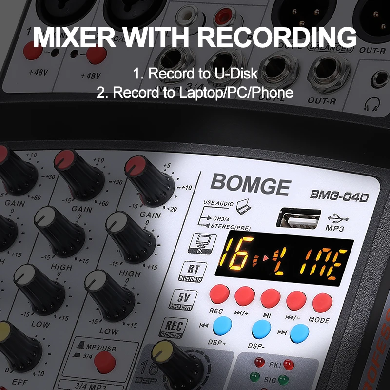 【Профессиональный 4-канальный аудио смеситель】BOMGE BMG-04D является профессиональным 4-канальный микшерный пульт, в том числе двое подойдет как для повседневной носки, так входных каналов, один стерео входного канала и USB входной канал, с 6,3 мм, XLR Сделано в Китае, RCA разъемы для подключения различных устройств, такие как конденсаторный микрофон, динамический микрофон, беспроводной микрофон, гитара, пассивный динамик и т. д. Подходит для студии записи, Системы общественных адресов, баров, вещания, прямой трансляции, телевидения и пост-продакшн фильмов и т. Д.