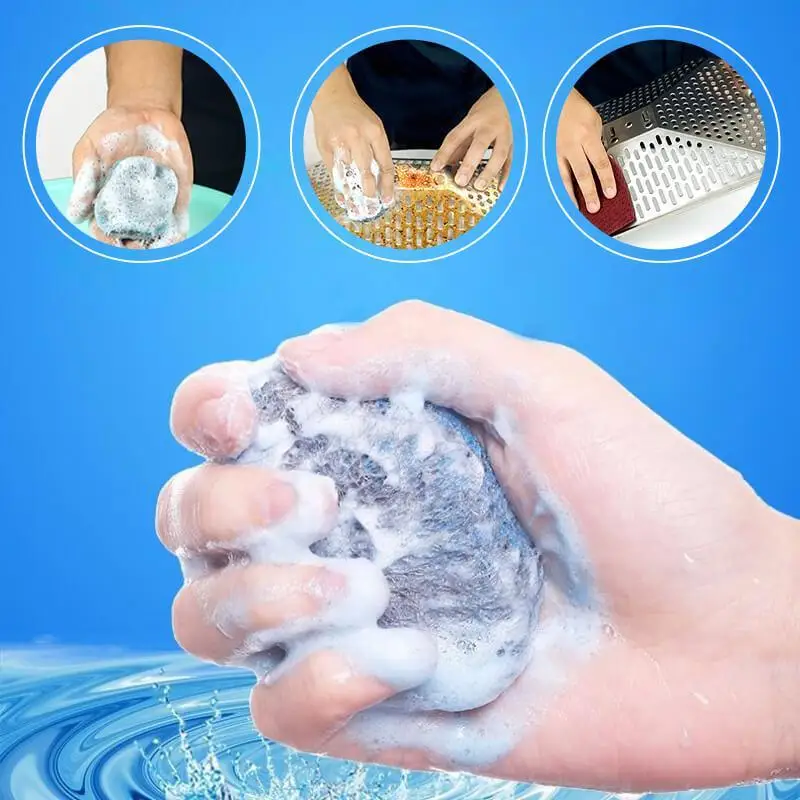 Стальные ватные мыльницыИзготовлен из пищевой тонкой стальной проволоки, с богатым составом эффективного мыла, Поэтому они готовы мыть и удалять жесткие загрязнения прямо из упаковки, иНе царапает поверхность.