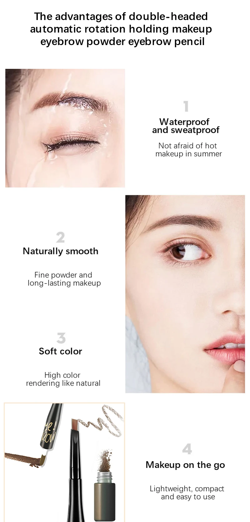 Продукт имеет двуголовый дизайн, один для карандаша для бровей, а другой для порошка для бровей, который удобен и прост в использовании.