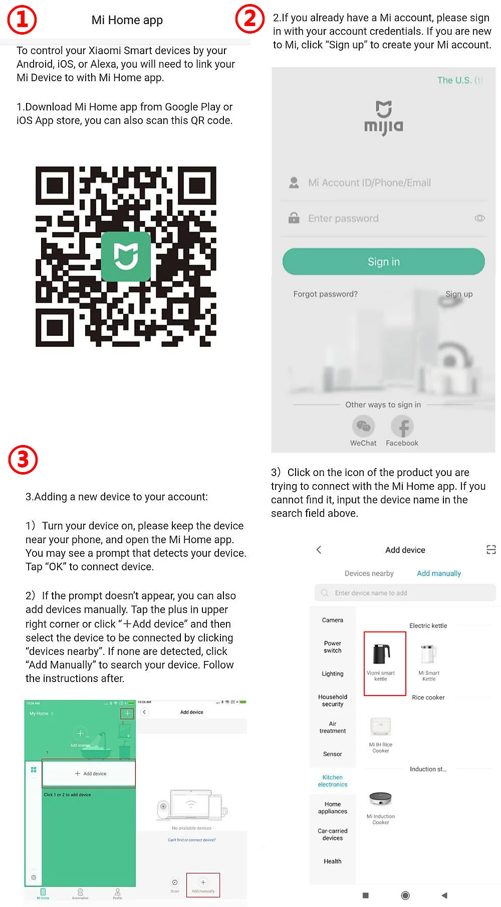 1.) Найдите и загрузите приложение «Mi Home» в Google Play или APP Store. 2.) Создайте учетную запись Mi, затем Войдите в свою учетную запись. 3.) нажмите кнопку «+ добавить устройство», «устройства рядом» для поиска продукта или вручную введите имя устройства «смарт-чайник Viomi» и подключение.