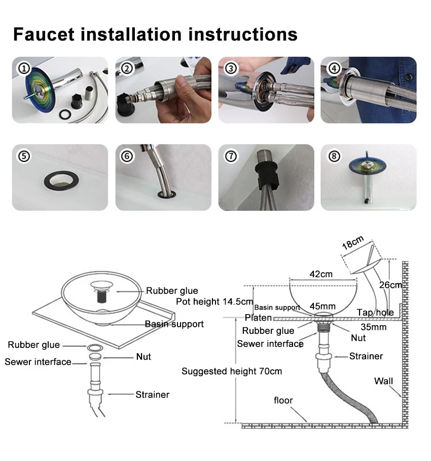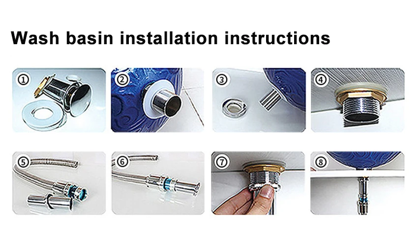 1. Подготовьте держатель таза, резиновое кольцо и резиновую прокладку.2. Поместите верхнюю половину слива в сливное отверстие, а затем установите резиновую прокладку, чтобы приклеить к раковине.3. Затем выровняйте держатель таза с сливным отверстием на столешнице и положите на него таз.4. Положите резиновое кольцо на половину слива под столешницу и затяните золотую гайку.5. Выньте нижнюю половину слива и сливную трубу.6. Отвинтите гайку сверху канализационной трубы немного, не нужно откручивать все, затем подключите канализацию и затяните ее7. Приклейте нижнюю половину Соединенного Слива с верхней половиной8. Раковина установлена.